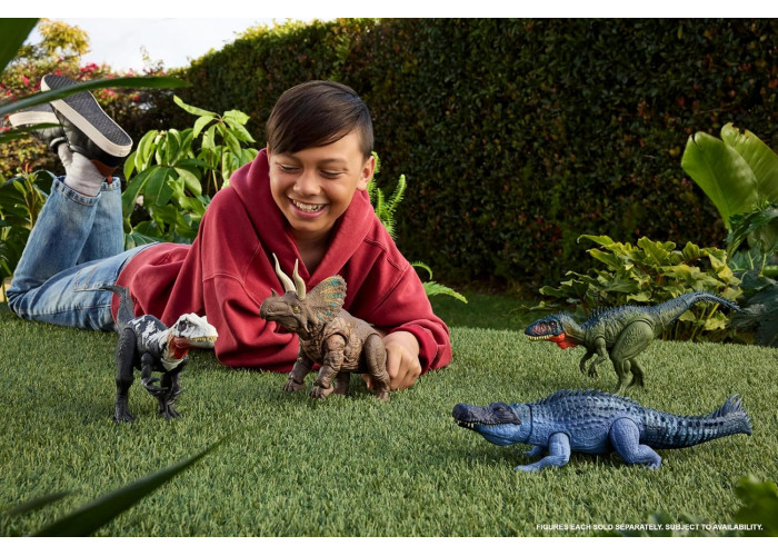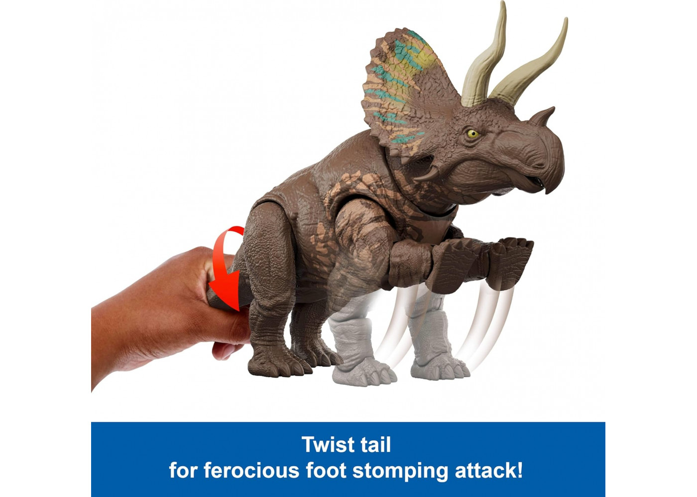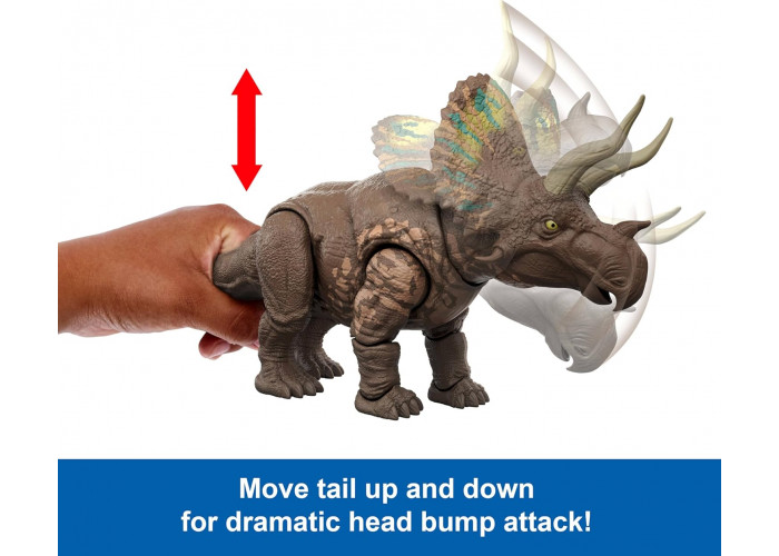 Динозавр еотрицератопс, натхненний «Світом Юрського періоду: Відродження», оживає у цій фігурці «Гігантські молотильники» із двома запеклими рухами.