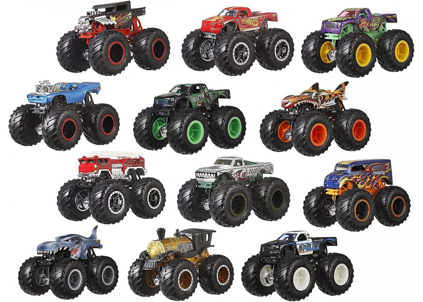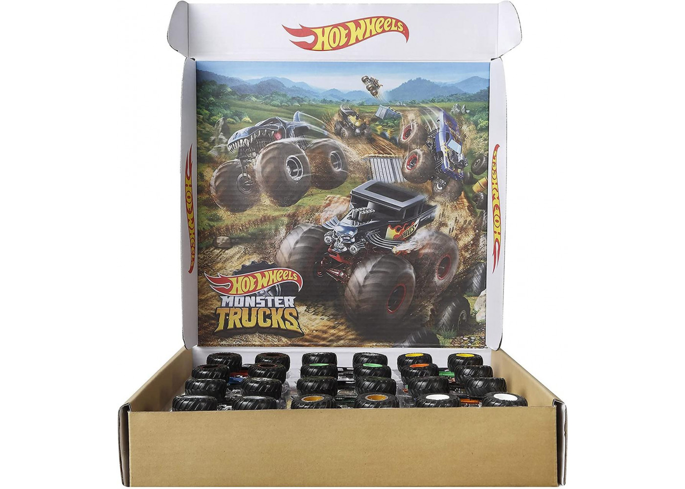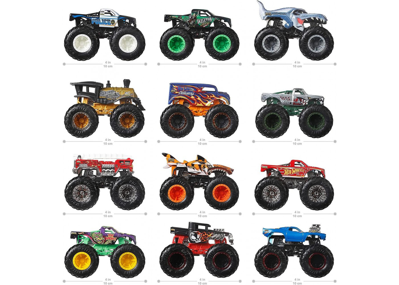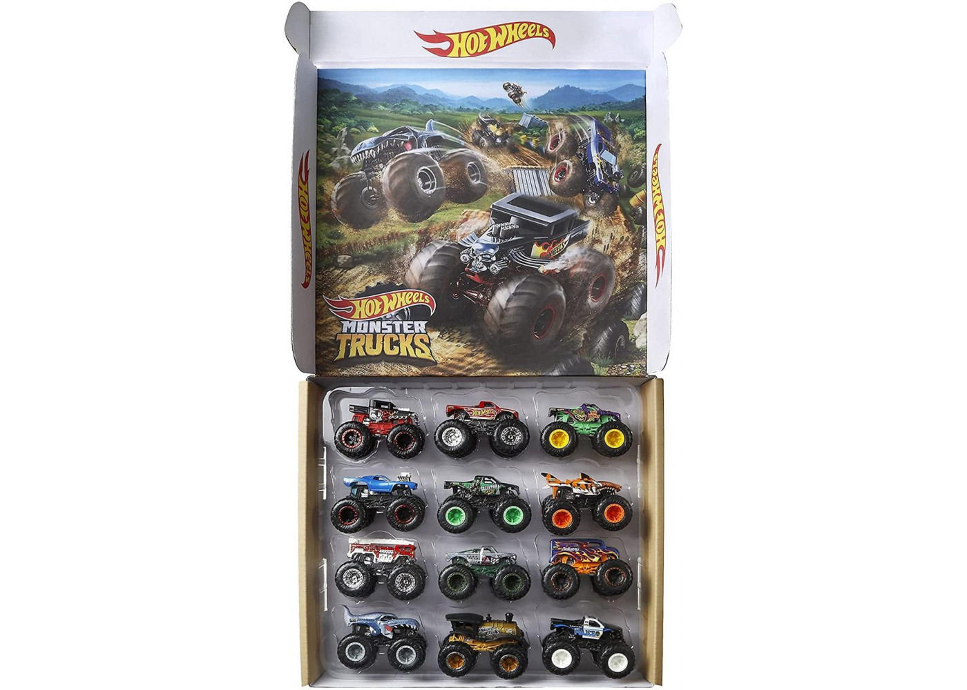 Hot Wheels Monster Truck - набір з 12 вантажівок у масштабі 1:64 з гіганськими колесами та приголомшливим дизайном. У ньому представлені дванадцять найкрутіших вантажівок, виготовлених з моменту заснування бренду! Допоможіть дітям швидко створити колекцію за допомогою одного зручного набору ретельно відібраних переможців. Поставляється у спеціальній упаковці, створеній для покращення подарунків та розпакування. Крім того, ви можете використовувати коробку як валізу для зберігання та брати із собою в дорогу.
