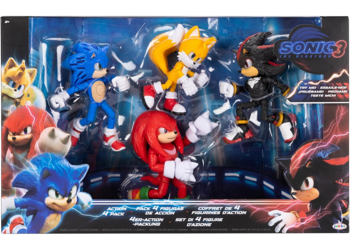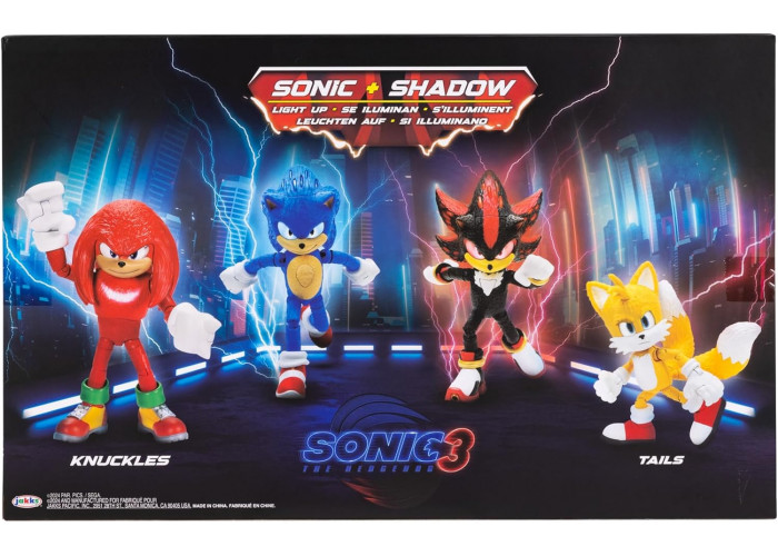 Цей набір з 4 фігурок в масштабі 12,7 см за мотивами фільму «Сонік Їжачок 3» включає Тейлза, Соніка, Наклза і Шедоу! Ці розкішні рухливі фігурки з деталями, що точно відтворюють сцени з фільму, ідеально підходять для динамічних бойових поз, що дозволяють відтворити ваші улюблені сцени. Сонік і Шедоу оснащені функцією підсвічування, яке висвітлює їхні очі та голки, щоб по-справжньому оживити дію! В упаковці є інструкція, щоб побачити підсвічування.