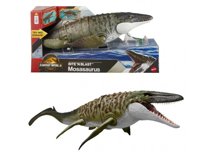 Мир Юрского периода жив! Принесите домой волнение и острые ощущения от возрождения Мира Юрского периода с этим уникальным Мозазавром с захватывающими движениями Bite 'N Blast, сочлененными плавниками и хвостом и размером 65 см !