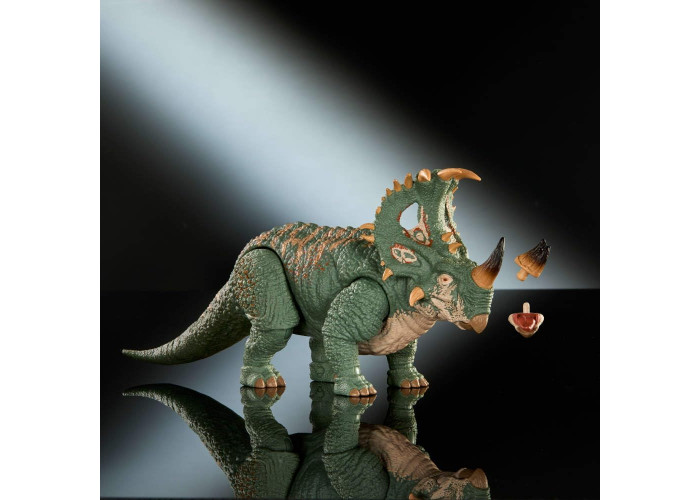 - Для воссоздания сцены с лавой эта фигурка Синоцератопса поставляется со сменными рогами – одним целым и одним сломанным. У нее также есть сменная нижняя челюсть – одна для позы с открытым ртом, другая для закрытой.