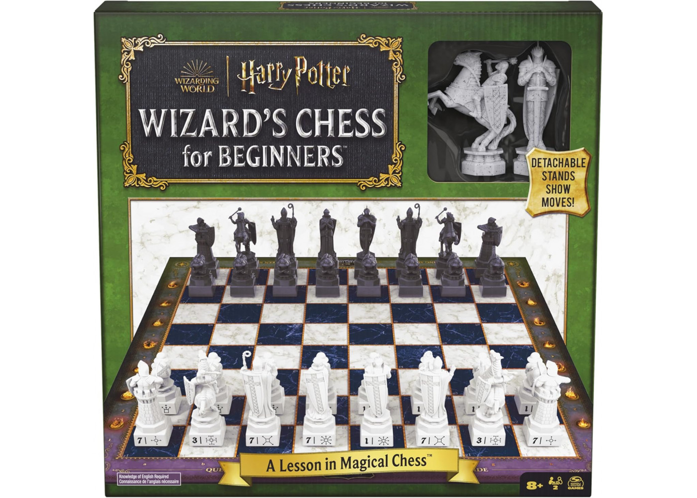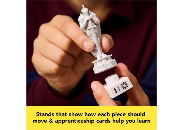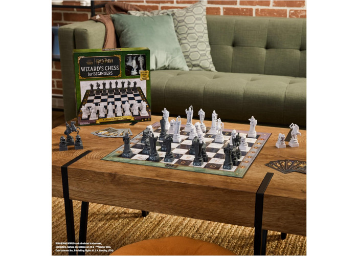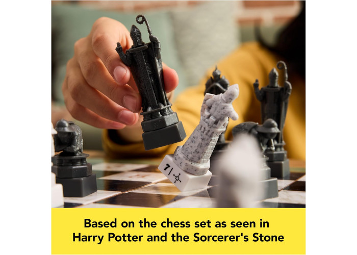 Запрошуємо всіх бажаючих навчитися грати у шахи Чарівника! Стати учнем шахістів з цим двостороннім набором для початківців, який включає в себе детально відтворені шахові фігури з фільму «Гаррі Поттер і філософський камінь» зі знімними підставками, що показують, як повинна рухатися кожна фігура, а також картки для навчання, які допоможуть вам перетворити відточувати свої навички.