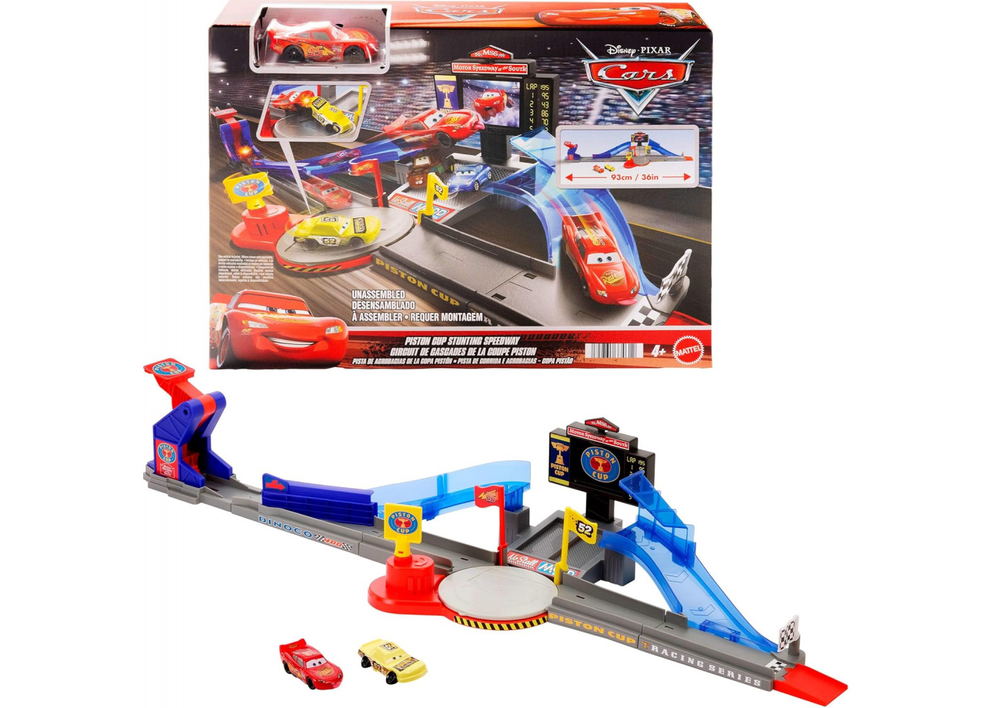 - Довжина набору складає 93 см і діти також можуть прикріпити додаткові траси або набори, щоб продовжити гонки. (Додаткові траси та набори продаються окремо.)