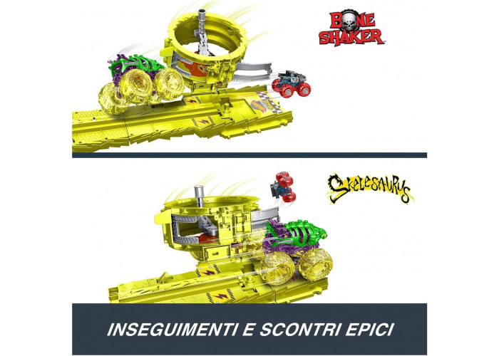 Величезний Скелезавр та Костяний Шейкер у масштабі 1:64 змагаються у гонці, намагаючись уникнути руйнування! Запустіть два автомобілі за допомогою вимикача живлення і подивіться, чи зможе Костяний Шейкер обігнати злого ворога, що мчить вниз схилом до величезної петлі.